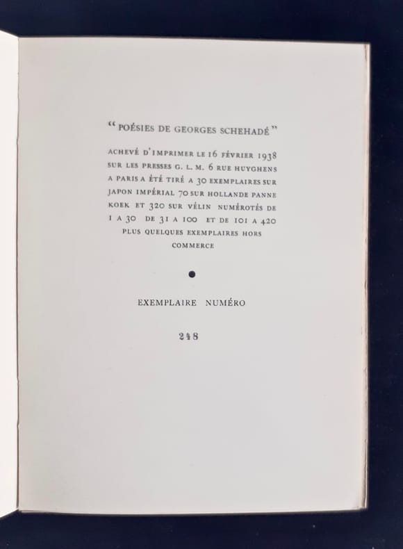 Paris: Guy Lévis Mano (GLM), février 1938. Un volume 19,1x14,3cm, broché de 88 pages sous couverture crème imprimée. Édition originale tirée à 420 exemplaires numérotés: 1/320 sur vélin. Bon état.