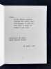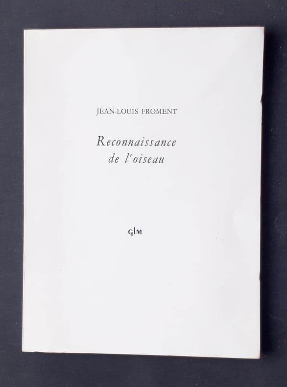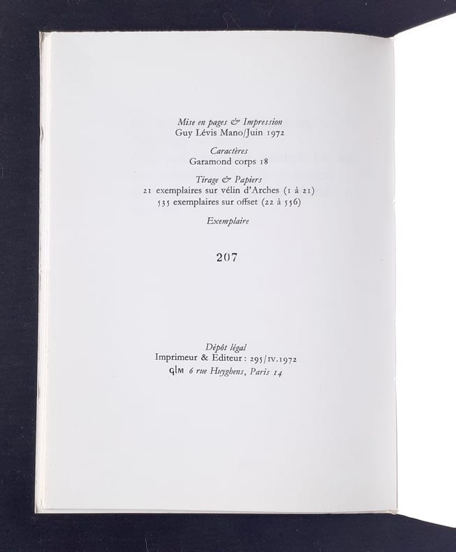Paris: Guy Lévis Mano (GLM), juin 1972 . Un volume 19,5x14,2cm, broché de 40 pages sous couverture blanche imprimée. Édition originale tirée à 556 exemplaires 1: 1/535 sur offset. Bon état.