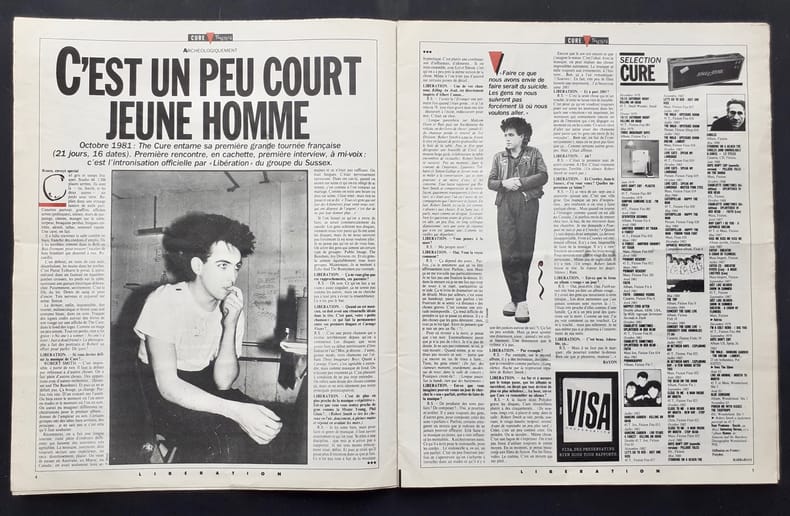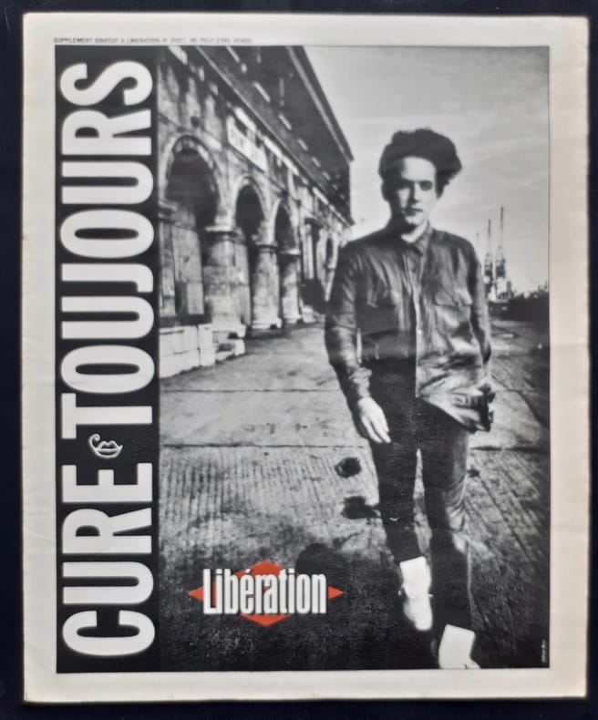 Paris : Libération, 1987. Journal (36,5x30,1 cm) en feuilles, 16 pages abondamment illustrées. Supplément du numéro 2007 du quotidien Libération rédigé par Lydie Barbarian et Bayon consacré entièrement au groupe The Cure. Bon état.