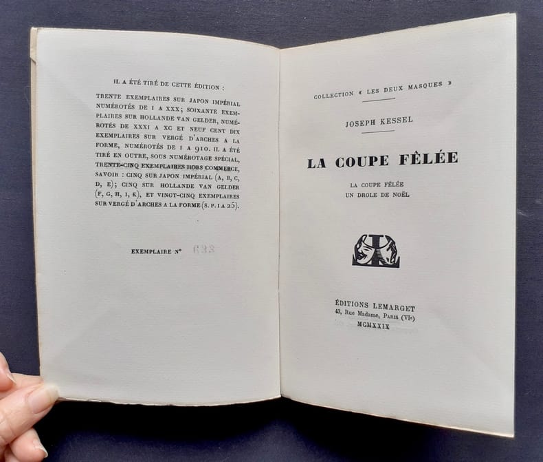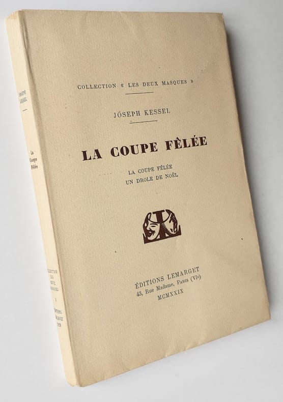 Recueil de 2 récits publiés en 1928 dans "Détective" par Joseph KESSEL (1898-1979): "La Coupe fêlée", "avec les Russes de Montmartre" et "Un drôle de Noël". Retirage du 3 octobre 1929 (édition originale: juillet 1929), tiré à 1015 exemplaires sur vélin bibliophile (numérotés de 1000 à 2000 et 15 hors commerce): exemplaire justifié n°1574, en originale reliure amateur.