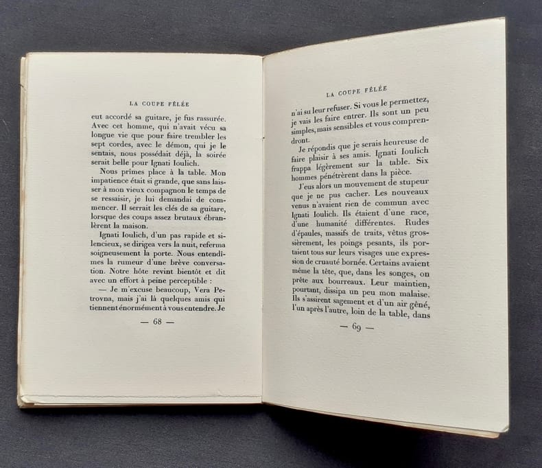 La "coupe fêlée" relate les aventures dramatiques de russes exilés, et d'abord celles Véra Pétrovna, rencontrée par l'auteur à Montmartre. Bon état (dos lég. passé, bon exemplaire par ailleurs, ex-libris en garde).