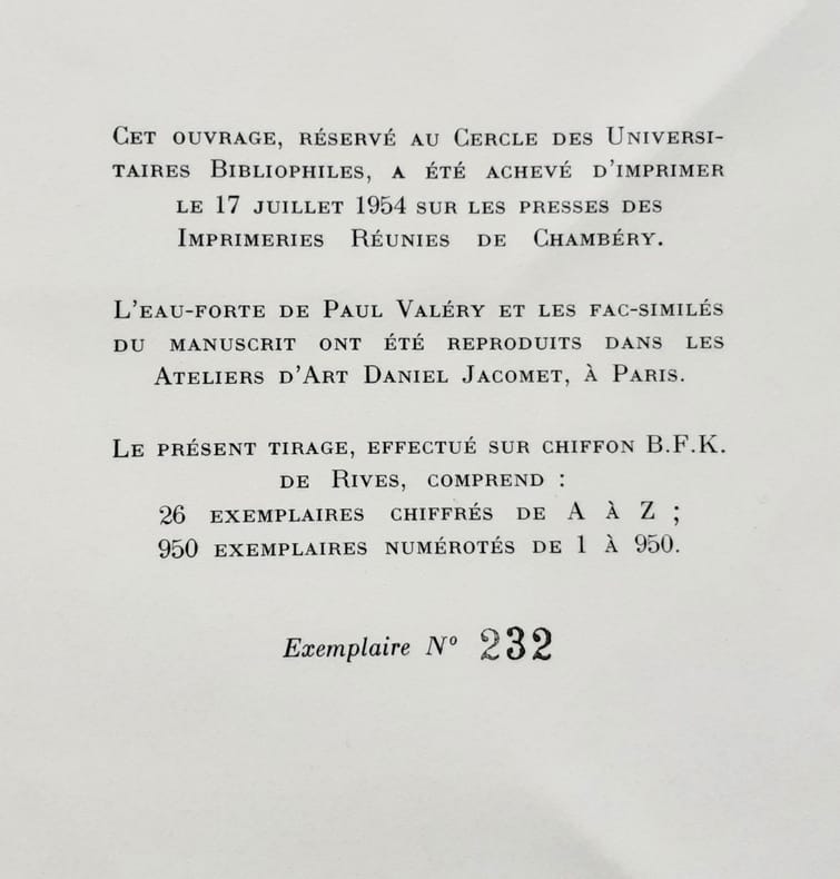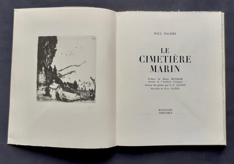 Préface de Henri Mondor. Genèse du poème par Lloyd James Austin. Grenoble : Editions Roissard, 1952. Un volume broché (28,5x23 cm) sous couverture rempliée, (84) pages. Eau-forte de Paul Valery reproduite en frontispice. Manque l'étui + les fac-similés du manuscrit en feuillets sous chemise. Edition originale tirée à 976 exemplaires numérotés sur B.F.K. de Rives. Bon état.