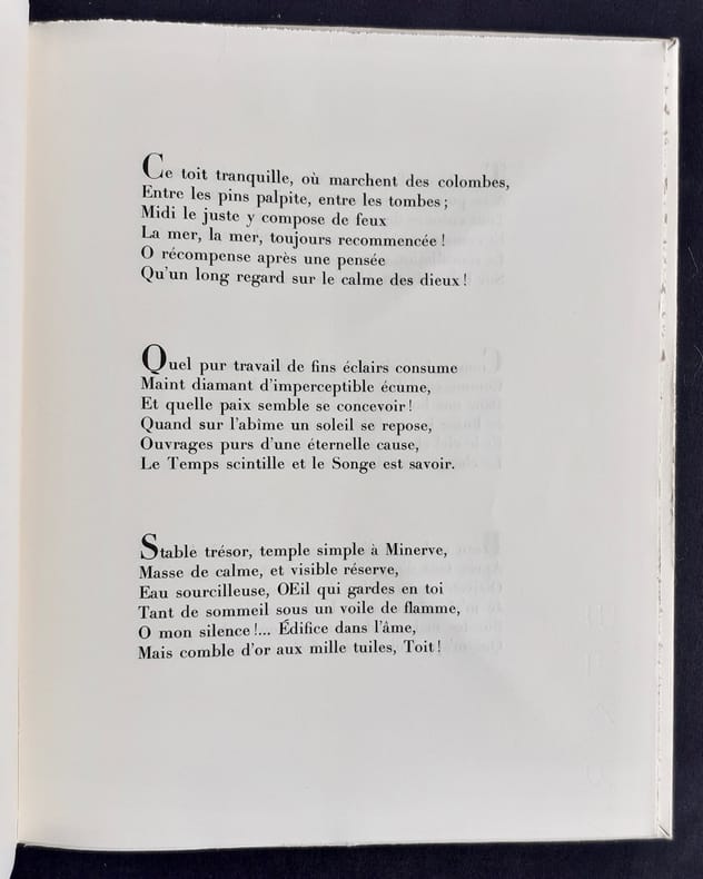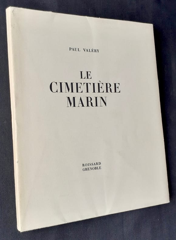 « Ce toit tranquille, où marchent les colombes, entre les pins palpite, entre les tombes ; Midi le juste y compose de feux, La mer, la mer, toujours recommencée ! » Ces vers comptent parmi les plus célèbres de la poésie française du XXè siècle. Qu'en dire ? Qu'ils paraissent à la N.R.F. en juin 1920, puis en volume, donc, et qu'il sera repris dans Charmes (1922). Ensuite, l'on pourra gloser sur l'obsédante musique du décasyllabe, l'image de Sète, les rivages de l'enfance, de la mythologie ou du cimetière Saint-Charles (qui prendre le nom définitif de cimetière marin en 1946). Sans se tromper, dire ensuite qu'il s'agit de l'oeuvre la plus lyrique et la moins cérébrale de l'auteur, qui rend palpable, avec un art consommé de l'allitération, la sensualité du paysage, du soleil, de l'azur et de la mer. Bel exemplaire.