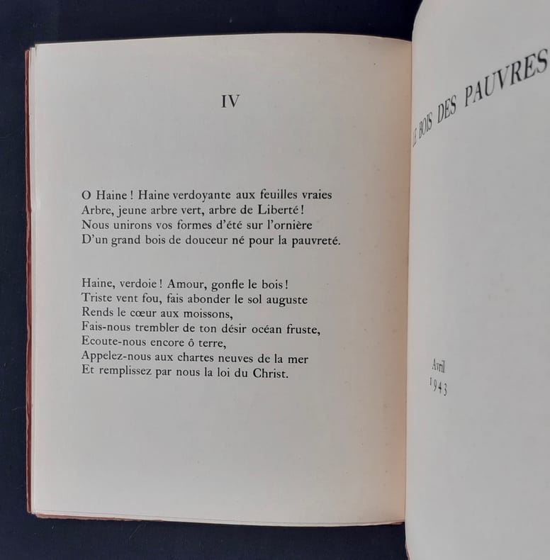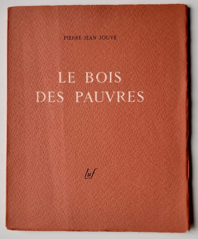Fribourg, Egloff, (30 avril) 1943 1 vol. (230 x 285 mm) de 17 pp., [3] et 2 ff. Broché. Édition originale. Un des 153 exemplaires numérotés sur vélin chiffon (n° 1). Envoi signé : « pour Jacques et Mireille Martineau [LE BOIS DES PAUVRES] du temps des épreuves, avec la plus cordiale sympathie de pensée. Pierre Jean Jouve. Décembre 1938 ».