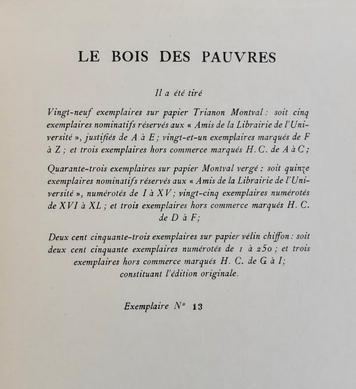 Un des 250 exemplaires numérotés sur papier vélin chiffon (tirage: 325 expl.).