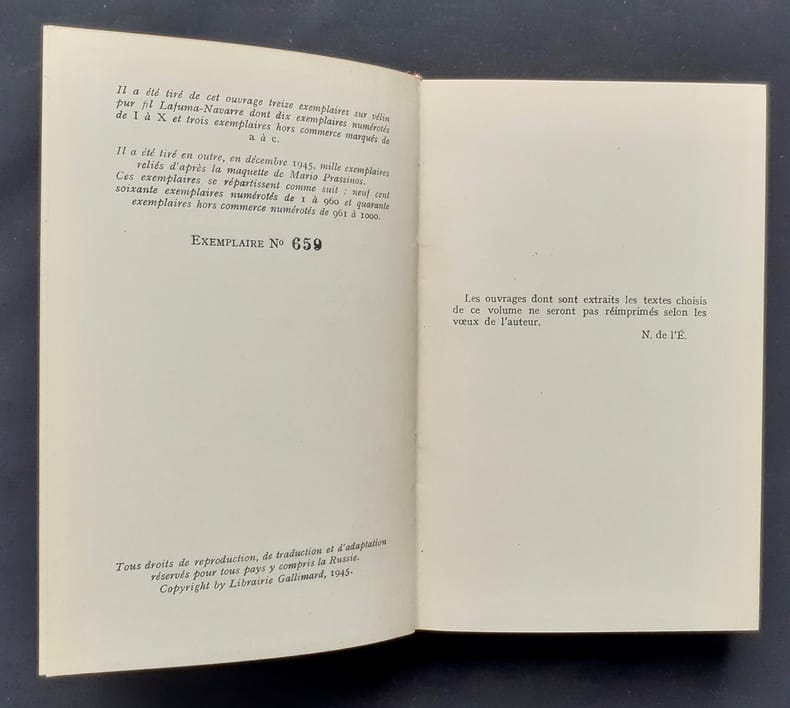Paris : Gallimard, décembre 1945. Un volume (18x12cm) cartonné orné d'un décor en trois tons par Mario Prassinos. 284 pages. Tirage limité à 1013 exemplaires numérotés. Bel exemplaire au cartonnage en bon état, bien frais.