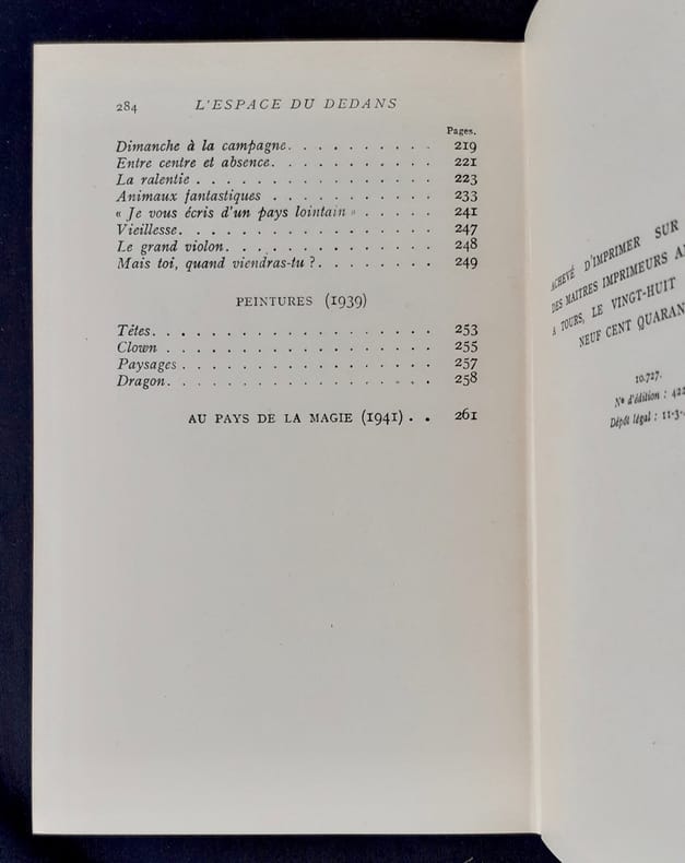 Paris Gallimard 1945 In-12, cartonnage de l'éditeur orné sur les plats et le dos de compositions en couleurs dessinées par Mario Prassinos.Nouvelle édition, la seule sous cartonnage NRF, tirée uniquement à 1.000 exemplaires numérotés et reliés d'après une maquette de Mario Prassinos. Un des 40 exemplaires hors commerce.