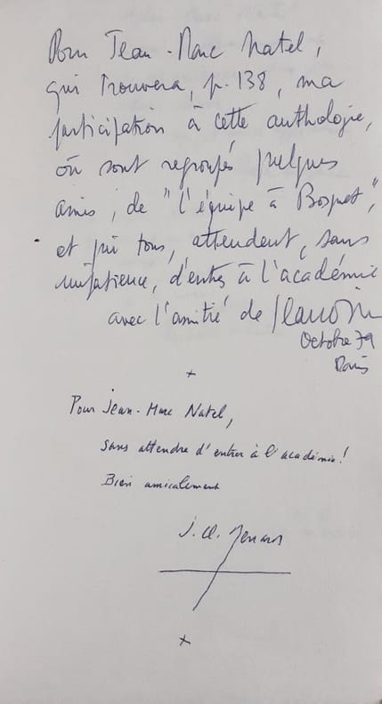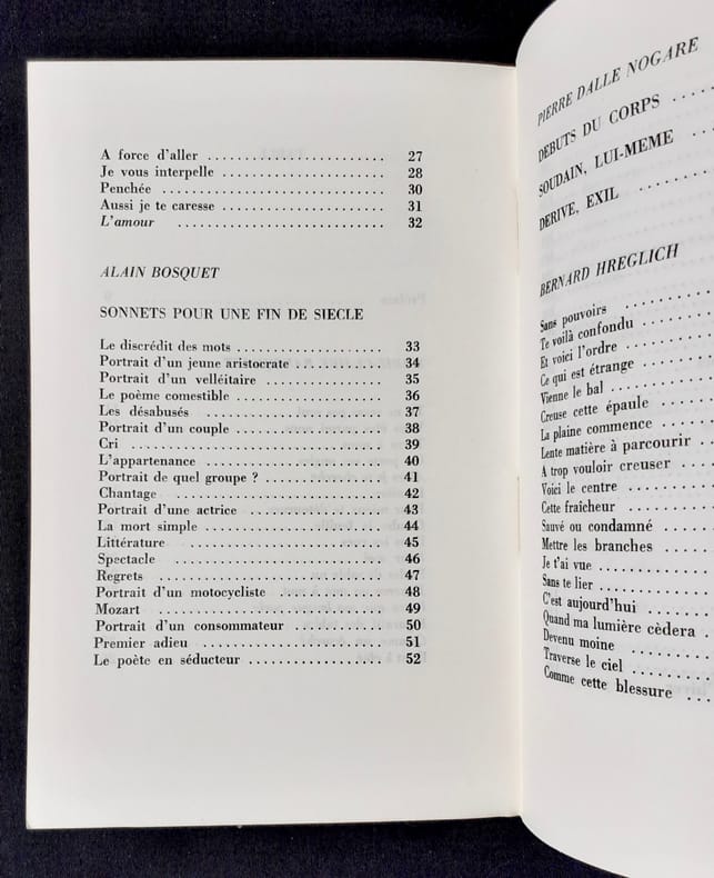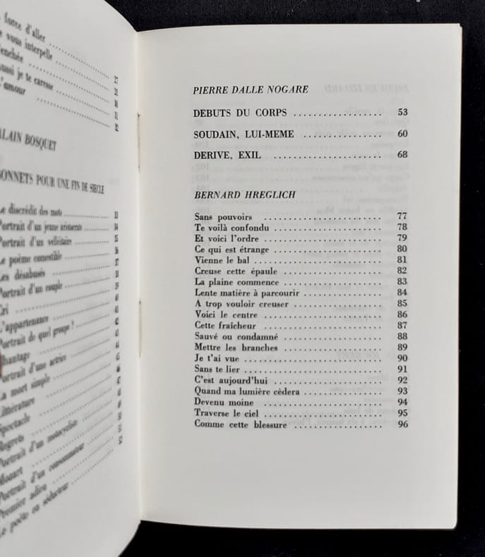 Paris : Editions Luneau Ascot, 1979. Un volume broché (21x14 cm), 261 pages. Avec 4 envois autographes signés des auteurs : Jean Orizet, Jean-Claude Renard, Marie-Claire Bancquart, Robert Sabatier au poète Jean-Marc Natel. Première de couverture légèrement jaunie sinon bon état.