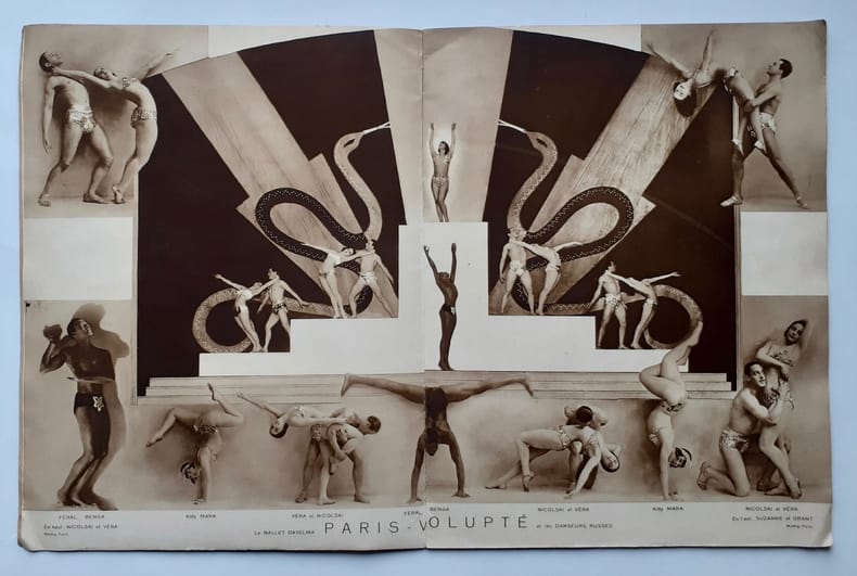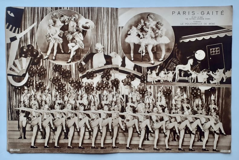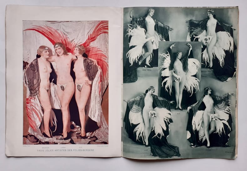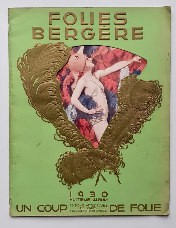 Paris : Editions Artistiques, 1930. Un volume (31,5x34,5 cm) agrafé, couverture gaufrée avec une fenêtre découpée. 24 pages entièrement illustrées en pleine page de photographies reproduites en héliogravure et en héliochromie, par Waléry (de son vrai nom Stanis aw Julian Ignacy Ostroróg), dans une mise en page spectaculaire. Coins légèrement émoussés sinon bon état. Edition originale du programme de tous les spectacles donnés aux Folies-Bergère en 1930.
