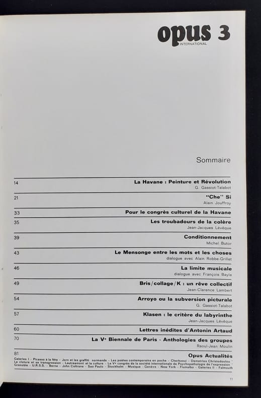 Numéro spécial consacré à Cuba. Lettres inédites d'Antonin Artaud. Articles sur Arroyo et Klasen, Vème biennale de Paris, etc.