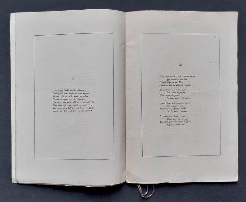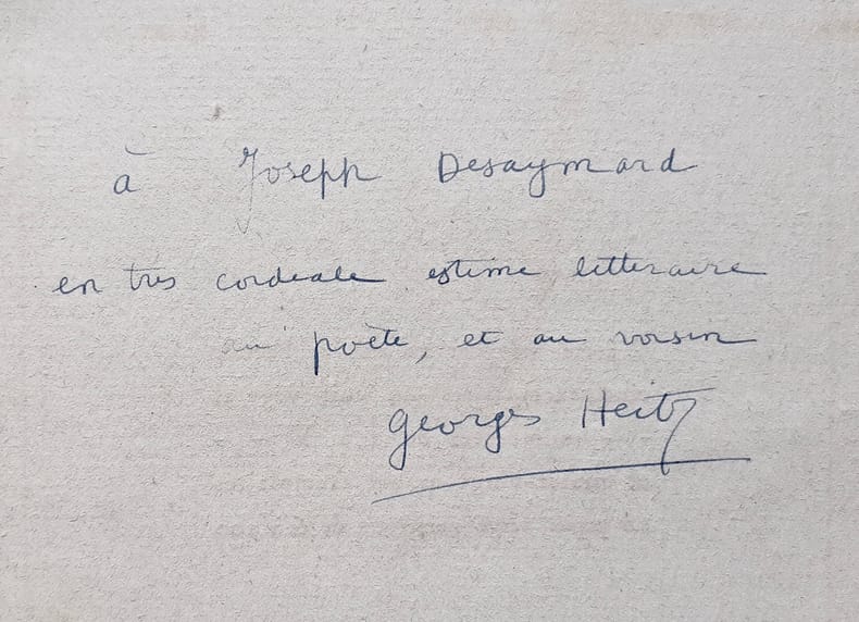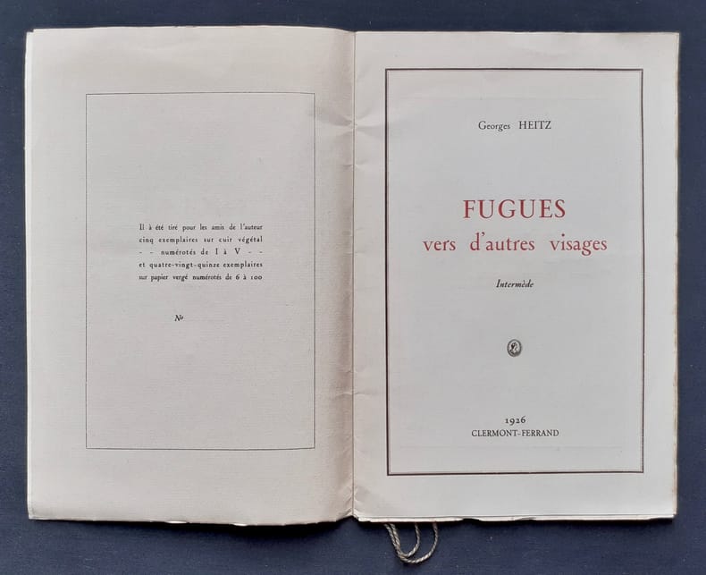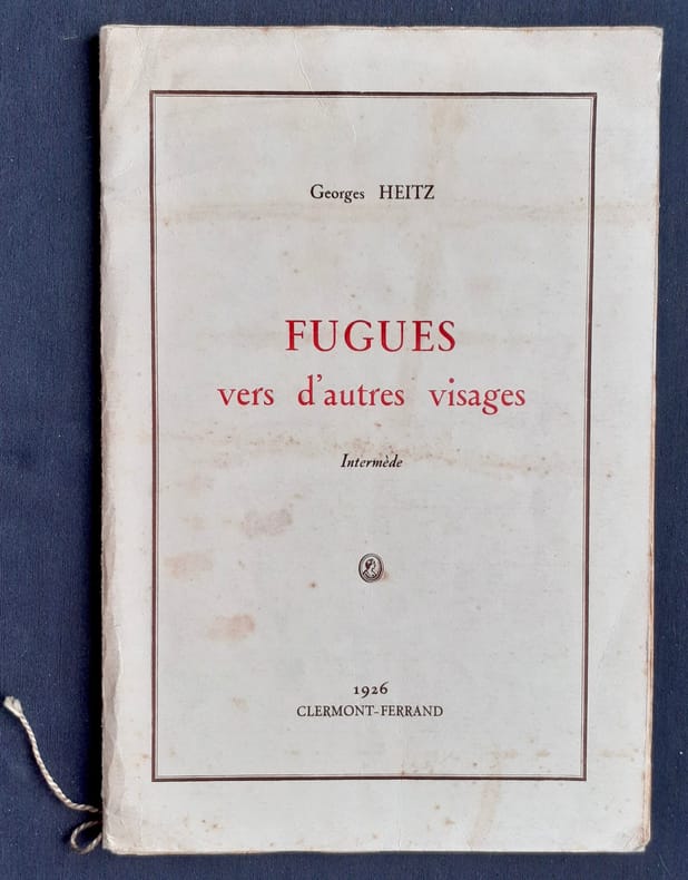 Clermont-Ferrand, chez l'auteur, 1926. un volume 27x18cm broché au moyen d'une cordelette, 24 pages sur papier vergé. Edition originale tirée à 105 exemplaires (celui-ci non justifié) avec un envoi autographe signé de Georges Heitz adressé à l'écrivain et artiste auvergnat Joseph Desaymard. Couverture poussiéreuse sinon bon état.