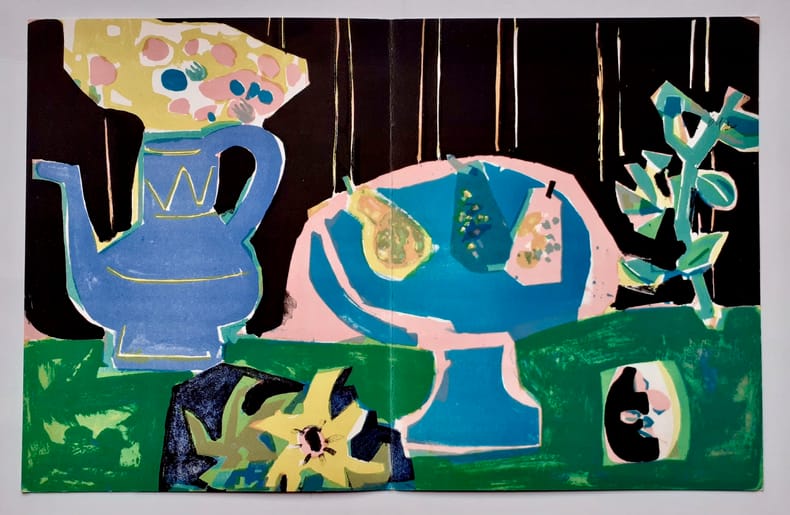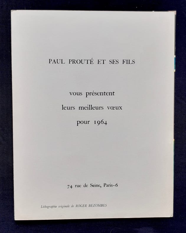 Carte de voeux pour 1964 de la galerie Paul Prouté à Paris. Un feuillet 27x21cm de quatre pages imprimée avec grande lithographie en couleurs pleine page sur les deux pages intérieures. Très bon état.