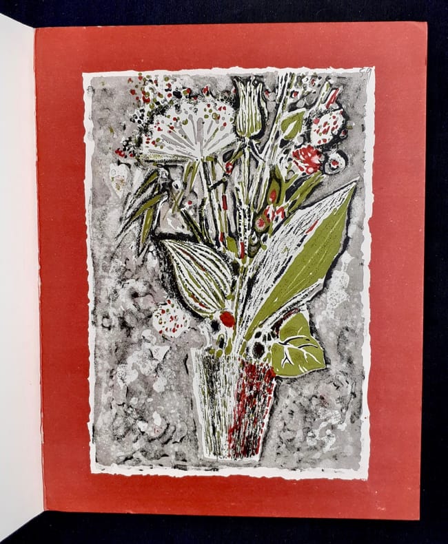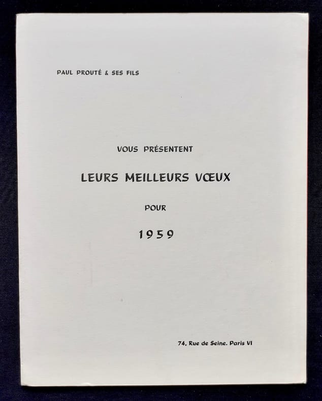 Carte de voeux pour 1959 de la galerie Paul Prouté à Paris. Un feuillet 27x21cm de quatre pages imprimée avec grande lithographie en couleurs pleine page. Très bon état.