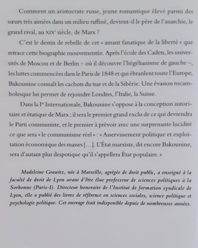Ed. du Cercle, Ed. de la Tête de Feuilles, 1971, in-8°, 257 pp, broché, couverture ornée d'un grand portrait noir et blanc. Bon état. A la fois une biographie de Bakounine et une histoire de ses idées, par un "social-démocrate et anarchiste" suisse (1874-1945). Traduit de l'allemand avec des annotations et 3 études par Jean Barrué : Bakounine et les "Annales franco-allemandes", la question du panslavisme de Bakounine, Bakounine et Netchaïev. Bibliographie (Coll. Archives révolutionnaires)