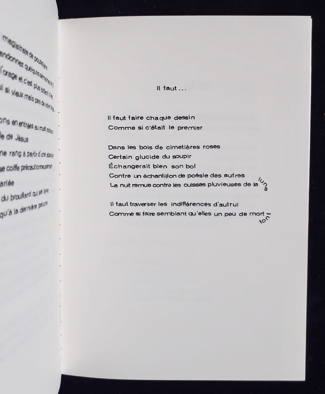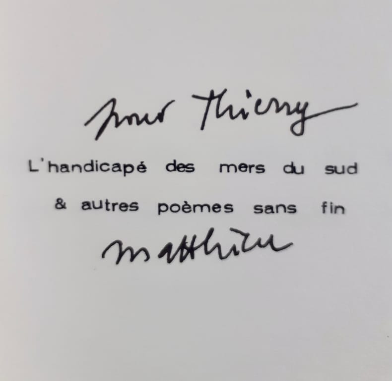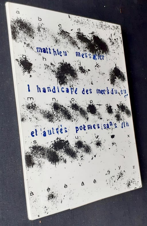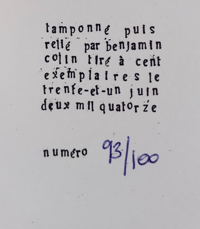 Editions Guillotine élastique, 2014. Un volume broché (18,5x13 cm) entièrement tamponné puis relié par Benjamin Colin, (48) pages. Edition originale tirée à 100 exemplaires numérotés à la main avec un envoi autographe signé de Matthieu Messagier. Bon état.