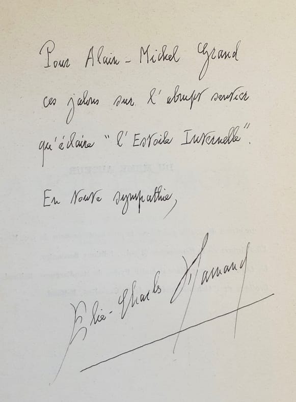 Préface d'Edmond Humeau. Illustrations de Louise JANIN. Paris, Le Point d'Etre, 1974, in-8, broché, 38 p. Edition originale. 5 hors textes dont la couverture. 1/60 ex. de tête num. sur verger (sic) accompagné d'une œuvre originale de Louise Janin, un cosmogramme, technique mixte sur papier selon un procédé artistique de son invention. Louise Janin, peintre et poète américaine, rencontrera dans les années 30 Kupka et Henry Valensi et participera au mouvement musicaliste et aux manifestations du groupe. Elie-Charles Flamand publiera un important article sur elle pour un catalogue d'exposition en 1974.