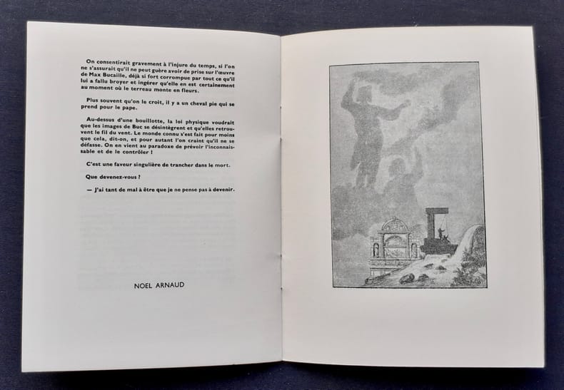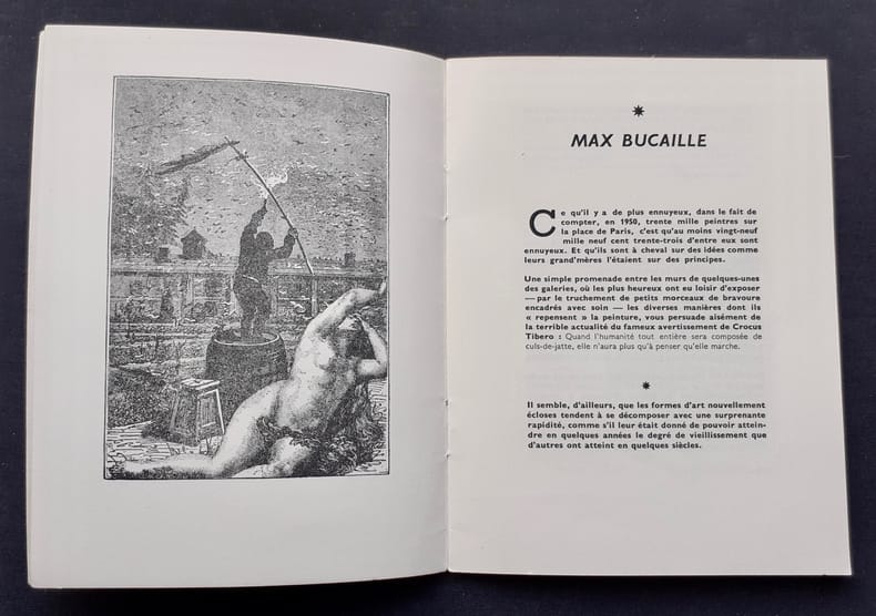 Edition originale de ce catalogue de l'exposition Max Bucaille organisée à Paris la Galerie Rive Droite en mai 1950. Le Messager boiteux de Paris fut une des petites revues et maisons d'édition confectionnées par Noël Arnaud et Jean-François Chabrun au début des années 1950.