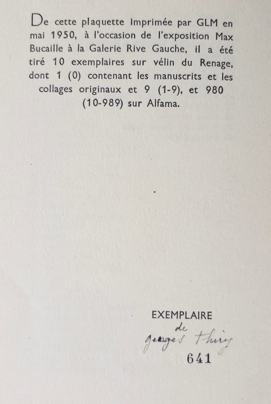 Illustré de deux reproductions de collages de Max Bucaille. Edition originale. Tirage à 990 exemplaires, n°266 sur alfama. Plaquette imprimée à l'occasion de l'exposition Max Bucaille à la Galerie Rive Gauche. Comprenant la liste de 40 oeuvres exposées. [02].