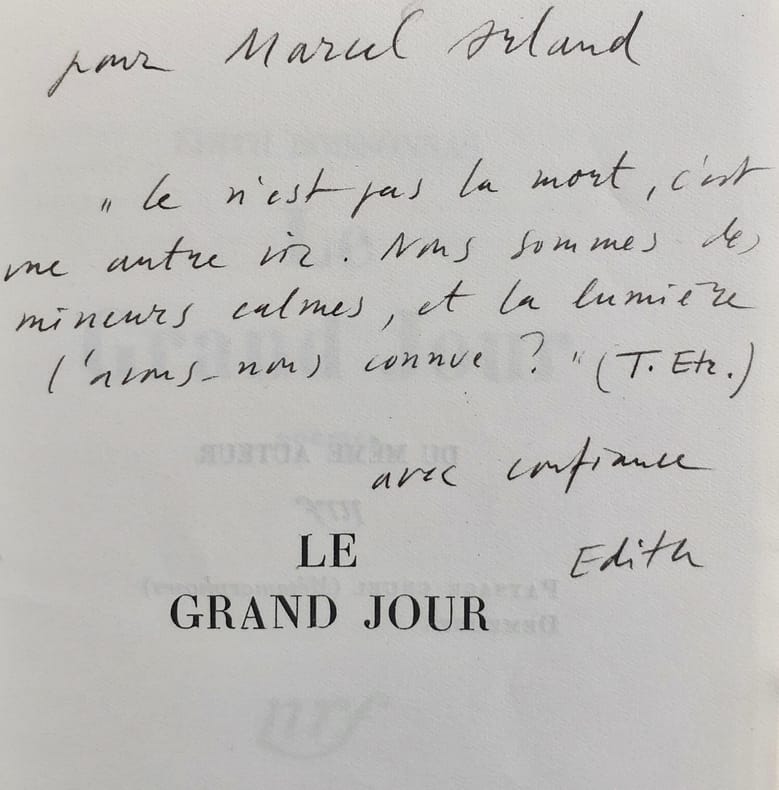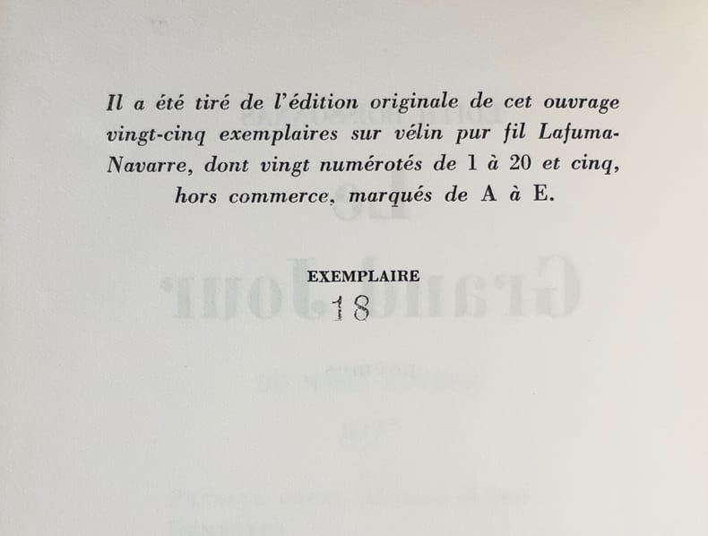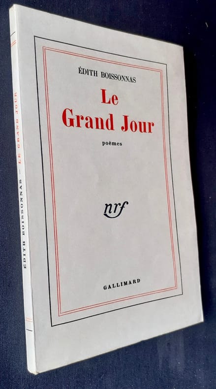 Paris : Gallimard, avril 1955. Un volume broché (19x12 cm), 74 pages. Edition originale numérotée, tirée à 25 exemplaires sur vélin pur fil Lafuma (seul grand papier) avec un envoi autographe signé d'Edith Boissonnas à Marcel Arland. Très bon état.