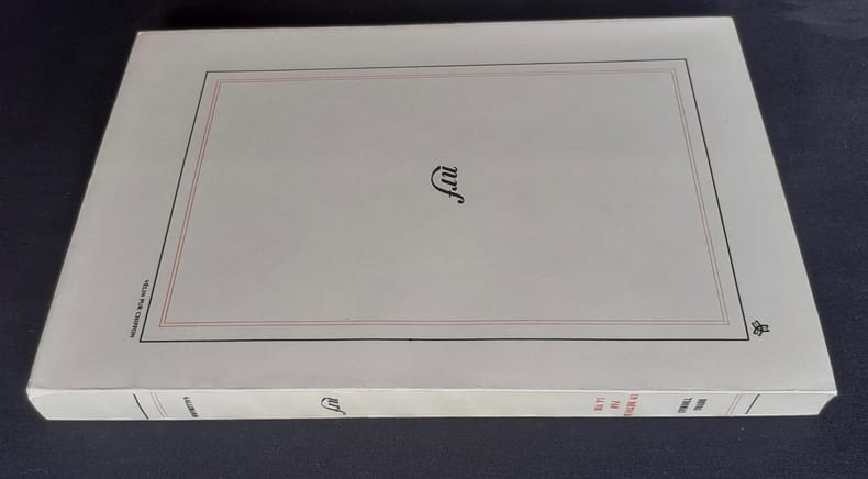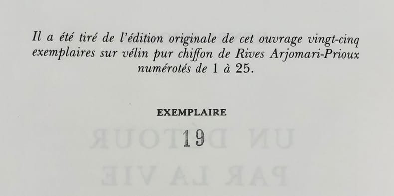 Paris : Editions Gallimard, 1988. Un volume broché (21,5x14,5 cm), 178 pages. Edition originale numérotée et tirée à 25 exemplaires sur vélin pur chiffon de Rives Arjomari-Prioux (seuls grands papiers). Très bon état.