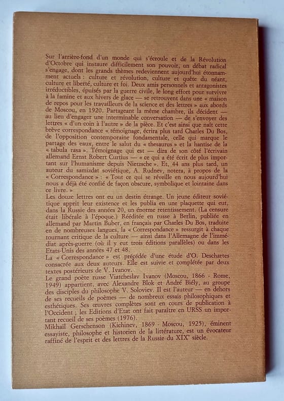 Les douze lettres de ce volume sont au sens propre, une "correspondance d'un coin à l'autre" d'une même chambre que le poète Viatcheslav Ivanov et l'historien Mikhail Gerschenson occupaient au cours de l'été 1920 en pleine guerre civile à Moscou.