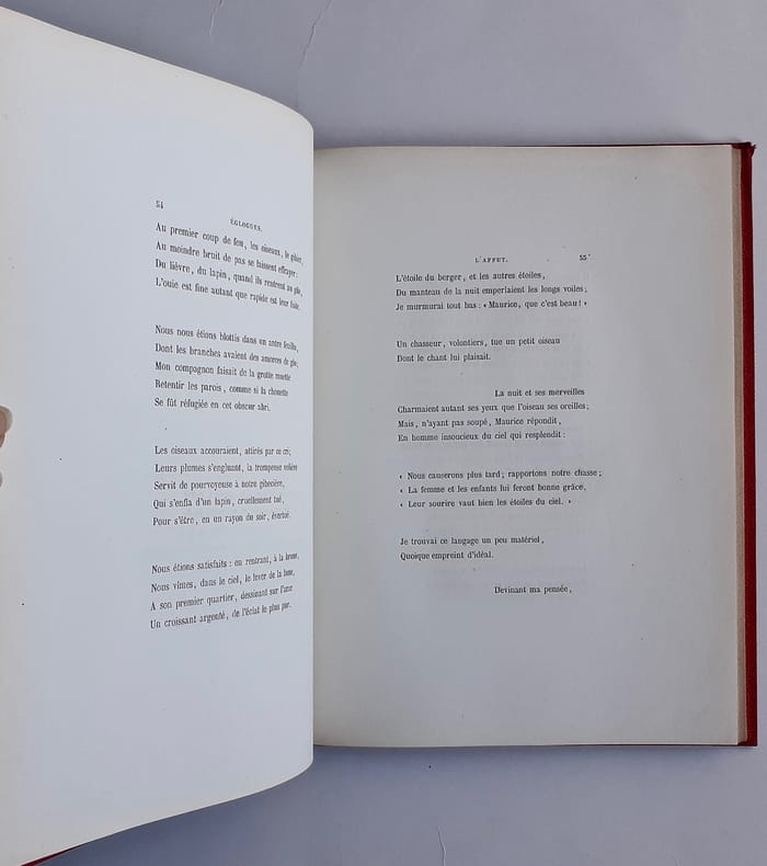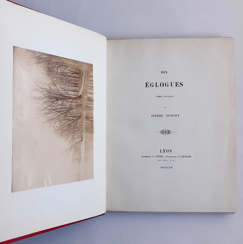 Lyon : Imprimerie de Pinier, 1864. Un volume demi-chagrin (25,8x20 cm), dos à nerfs orné du titre, auteur, filets et fleurons dorés, filets sur les plats (reliure de l'époque), 186 pages. Edition originale enrichie d'une photographie sur papier albuminé contrecollée en regard de la page de titre (15,8x12,2 cm), probablement une vue des bords de Saône. Bel exemplaire.