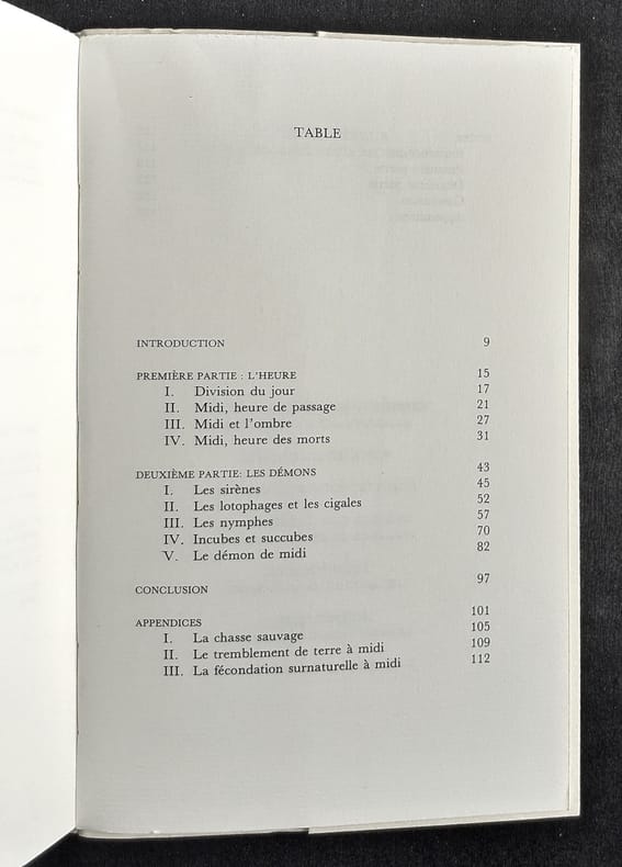 Édition originale française tirée à 1000 exemplaires (30 + 970), l'un des 30 numérotés sur vélin pur fil Johannot, seul tirage de tête, le n° 23. Frontispice d'André Masson en noir et vignette en rouge sur la couverture, reproduite en noir in fine. Dans le monde antique, ce nest pas à minuit quapparaissent dieux et démons, mais à midi. La thèse de Caillois, parue en 1937 (année dAcéphale et de lamitié avec Bataille) dans la "Revue dhistoire des religions" (CXVI, 2-3), navait jamais été publiée en volume en France. Elle constitue pourtant, en même temps quune étude prodigieusement érudite de la mythologie méditerranéenne, une profonde et troublante réflexion sur cette heure immobile où lhomme, confronté aux puissances mystérieuses, est exposé à tous les périls et à toutes les tentations.La présente édition originale a été précédée de peu par sa traduction en italien publiée à l'initiative de Carlo Ossola (I demoni meridiani, trad. d'Alberto Pellissero, Turin, Bollati Boringhieri, 1988),.