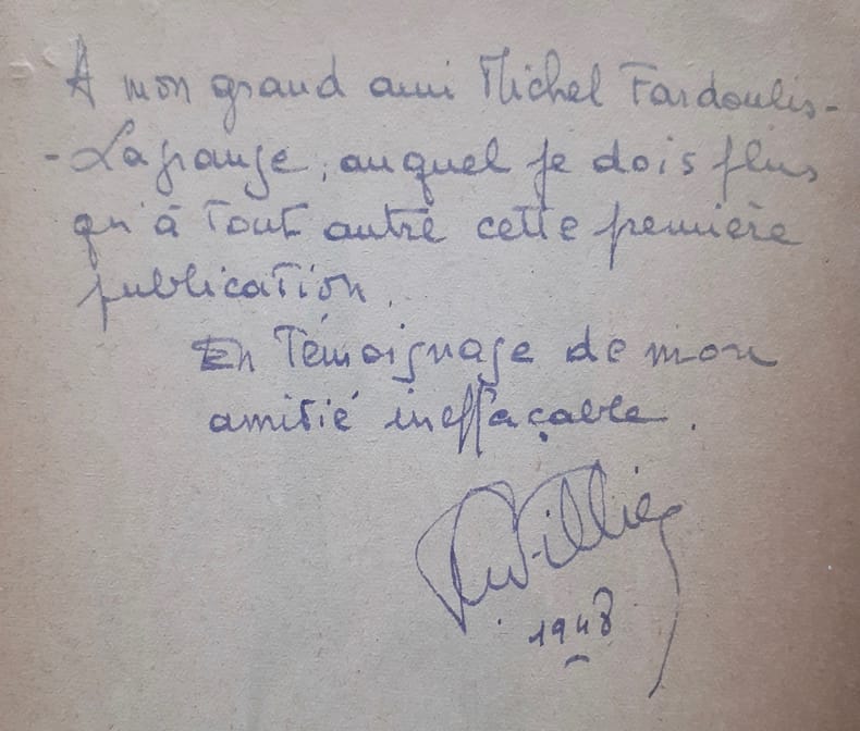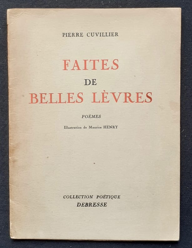 Editions Debresse (Collection "Poétique"), 1948. Un volume broché (19x14 cm), 16 pages. Un dessin de Maurice Henry en frontispice. Edition originale numérotée et tirée à 300 exemplaires avec un envoi autographe signé de Pierre Cuvillier à Michel Fardoulis-Lagrange. Bon état.