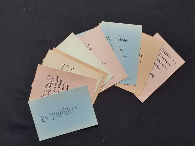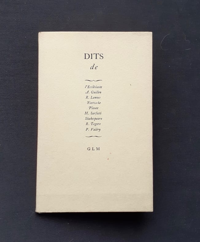 Paris: Guy Lévis Mano (GLM), décembre 1947. Un volume (15,2x9,7 cm), 14 feuillets libres imprimés au recto sur carte de couleurs, non numérotés sous couverture rempliée et imprimée. Édition originale tirée à 340 exemplaires numérotés : 1/25 réservés aux Amis de GLM numérotés à la main et signé par Guy Lévis Mano. Bon état.