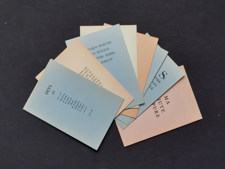 Paris, GLM, 1947. 15,2 x 9,7 cm. 14 ff. libres n. ch. Carte de couleur en feuilles, chemise imprimée à un rabat. Un des 300 ex. sur vélin du Marais. Seul le recto des cartes est imprimé. Légères rousseurs sur la couverture sinon bon exemplaire.