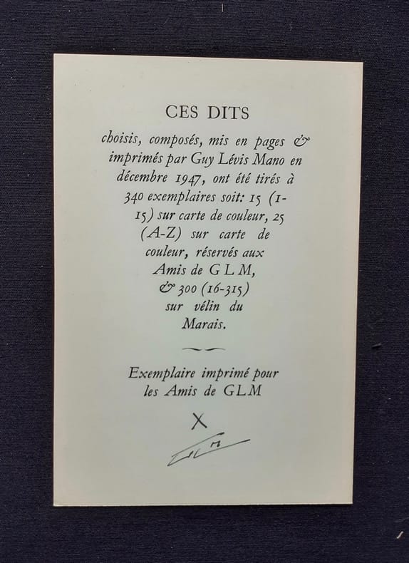 Paris: Guy Lévis Mano (GLM), décembre 1947. Un volume (15,2x9,7 cm), 14 feuillets libres imprimés au recto sur carte de couleurs, non numérotés sous couverture rempliée et imprimée. Édition originale tirée à 340 exemplaires numérotés : 1/25 réservés aux Amis de GLM numérotés à la main et signé par Guy Lévis Mano. Bon état.