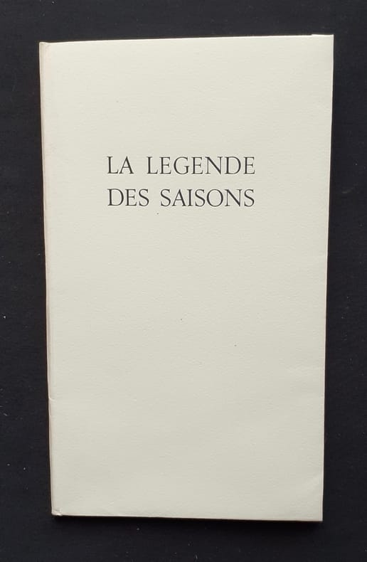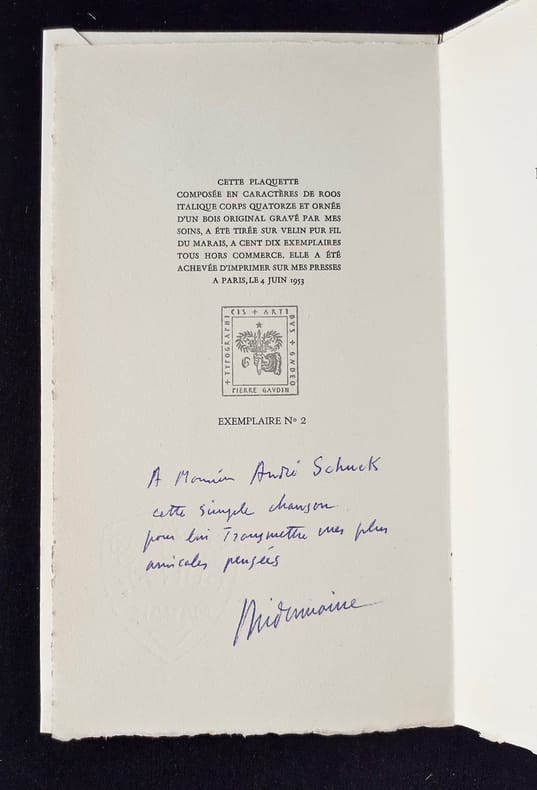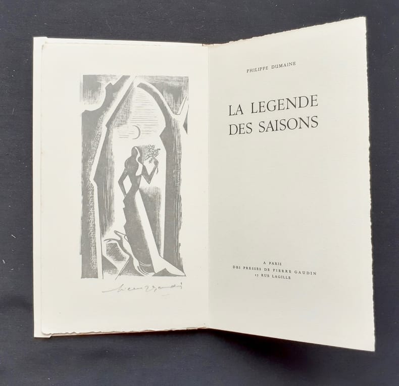 Paris : Presses de Pierre Gaudin, 1959. Un volume en feuilles sous couverture rempliée, 16 pages. En frontispice, bois signé de Pierre Gaudin.Edition originale tirée à 110 exemplaires numérotés sur vélin pur fil du Marais avec un envoi autographe signé de Philippe Dumaine. Bon état.
