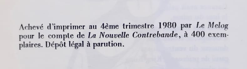 La nouvelle contrebande, 1980. Plaquette agrafée, 210 x 150 mm, 43 p. Edition originale publiée à 400 exemplaires. Couverture partiellement insolée, intérieur bon.