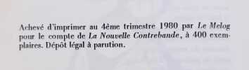 Paris : La nouvelle contrebande / Le Melog, 1980. Plaquette (21,2x14,8 cm) agrafé sous jaquette illustrée, 44 pages. Illustré de dessins de Jaro. Tirage à 400 exemplaires. Bon état.