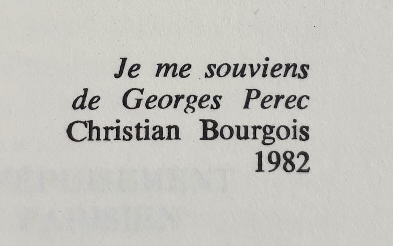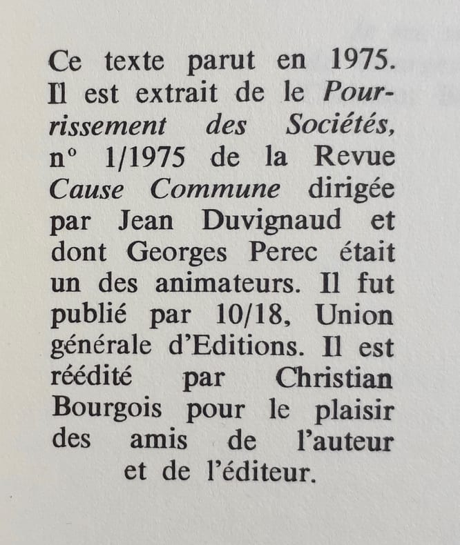 Paris : Edition Christian Bourgois, novembre 1982. Un volume broché (20x12 cm), 60 pages. Edition originale du texte seul sans grand papier annoncé. La première publication date de 1975 dans la revue Cause Commune dont Georges Perec était un des animateurs. Bon état.