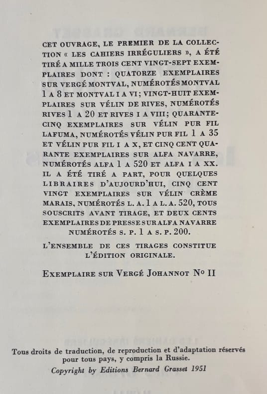 Paris : Editions Grasset (Collection Les Cahiers irréguliers), 1951. Un volume broché (22x17 cm), 40 pages. Exemplaire sur vélin crème Marais. Bon état.