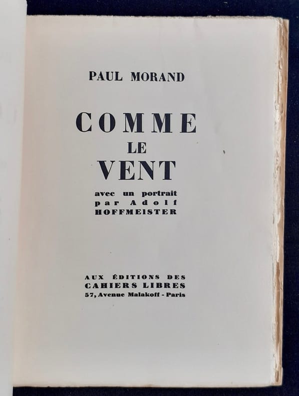 458. MORAND Paul : Comme le vent. Cahiers libres Paris 1928. E.O. L’un des ex. sur Lafuma. Portrait de l’auteur en frontispice par HOFFMESTER. Broché in-8, très bel état –