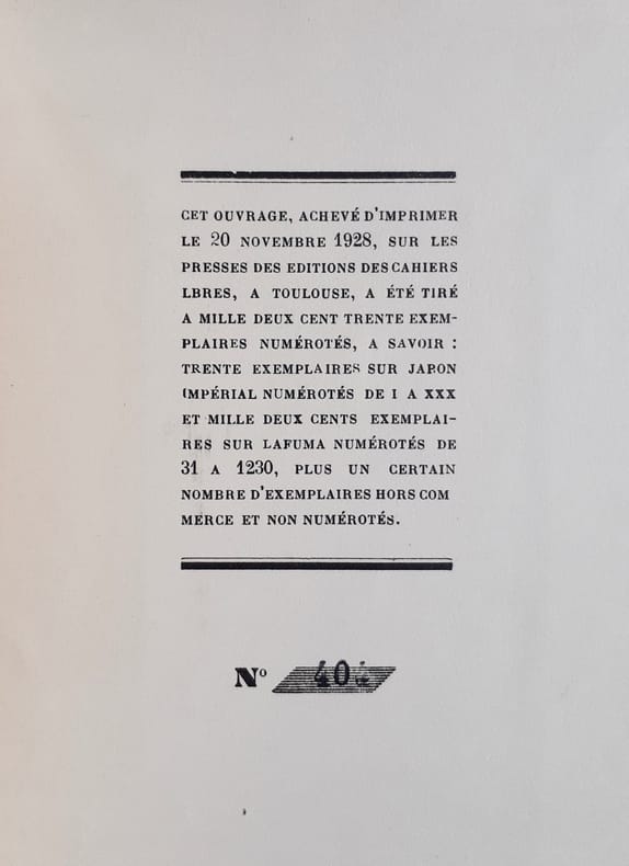 Paris : Aux Editions des Cahiers Libres, 1928 . Un volume broché (19,5x14,5 cm) sous couverture rempliée, 45 pages. En frontispice, un portrait d'Adolf Hoffmeister. Edition originale : 1/200 exemplaires sur Lafuma numérotés. Bon état.