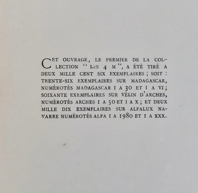 Paris : Editions Grasset (Collection "Les 4 M"), 1928. Un volume broché (19x14,3 cm), 56 pages. Edition originale : 1/2010 exemplaires sur alfalux Navarre numérotés XXIII. Traces d'hadhésifs sur la première et dernière page de garde. Bon état.