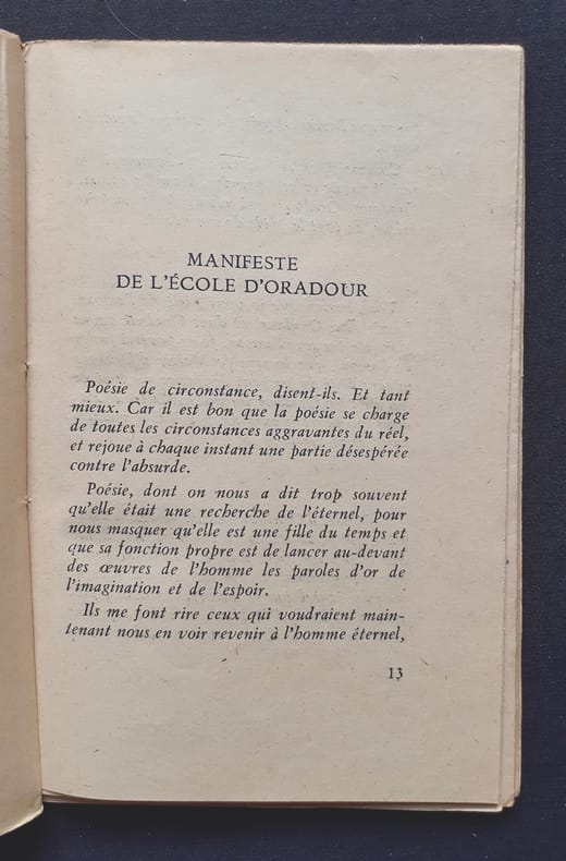 Paris : Editions Bordas, 1945. Un volume brroché (18,5x12 cm), 78 pages. En préambule, "Manifeste de l'école d'Oradour" par Jean Marcenac. Portrait de l'auteur par Jacques Grange en frontispice. Bon état.