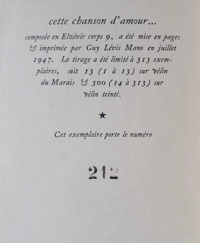 Paris: Guy Lévis Mano, juillet 1947. Un volume 16,8x11,5cm, broché de 48 pages sous couverture imprimée. Exemplaire en bon état. Édition originale tirée à 313 exemplaires numérotés: 1/300 sur papier vélin teinté.