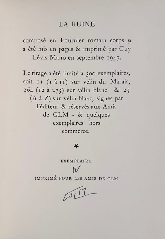 Paris: Guy Lévis Mano, septembre 1947. Un volume 16,8x11,7cm, broché de 38 pages sous couverture imprimée. Exemplaire en bon état. Édition originale tirée à 300 exemplaires numérotés: 1/25 ex. réservé aux Amis de GLM, sur papier vergé et signé par Guy Lévis Mano.