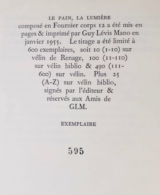Paris: Guy Lévis Mano (GLM), janvier 1955. Un volume 19,3x14,3cm, broché, 40 pages sous couverture imprimée. Exemplaire en bon état. Édition originale tirée à 600 exemplaires numérotés: 1/490 exemplaires sur papier vélin.