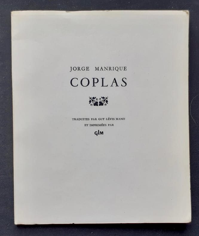 Traduction de Guy Lévis Mano en regard du texte espagnol (édition bilingue). Paris : La presse à main (GLM), avril 1947 - un volume en feuilles (16,3x13 cm) sous chemise à un rabat, 32 pages non numérotées. Edition originale tirée à 240 exemplaires numérotés : 1/25 sur vélin réservés aux Amis de GLM et signés par l'éditeur. Coplas a été imprimée sur la petite presse à main donnée en 1933 par Carlos Rodriguez-Pintos. D'où l'indication en page de titre qui remplace exceptionnellement la sigle de l'éditeur. Bon état.