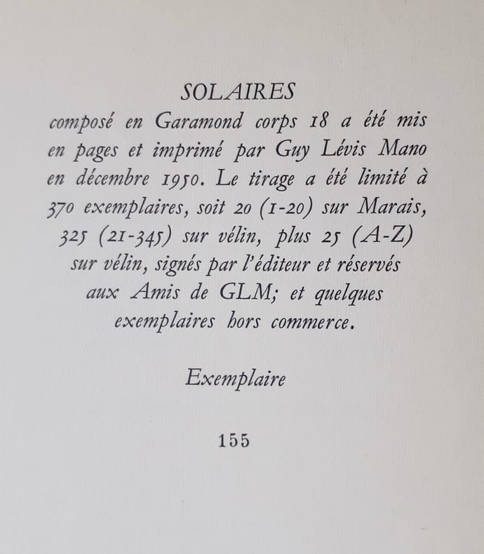 Paris : Guy Lévis Mano (GLM), décembre 1950. 1 volume (27,8x19,4cm), 40 pages. Edition originale tirée à 370 exemplaires : 1/350 sur vélin. Papier légèrement poussiéreux sur la partie supérieure de la première de couverture sinon bon état.
