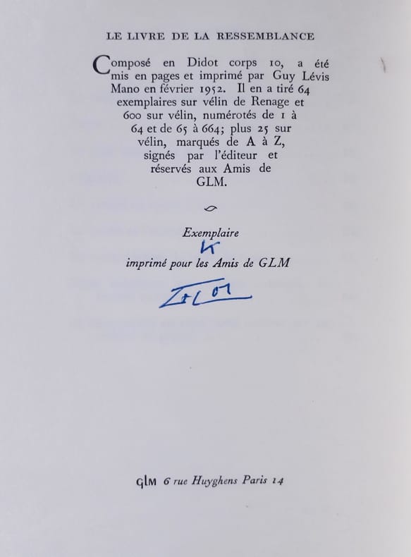 Paris : Guy Lévis Mano (GLM), février 1952. 1 volume (19,5x13,5 cm), 46 pages. Edition originale tirée à 664 exemplaires : 1/25 sur vélin imprimés pour les Amis de GLM, signé par Guy Lévis Mano. Bon état.