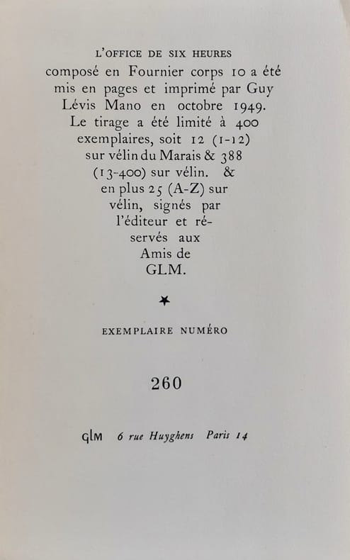 Paris : Guy Lévis Mano (GLM), octobre 1949. 1 volume (16,5x11,3cm), 40 pages. Edition originale tirée à 425 exemplaires : 1/388 sur vélin. Bon état.
