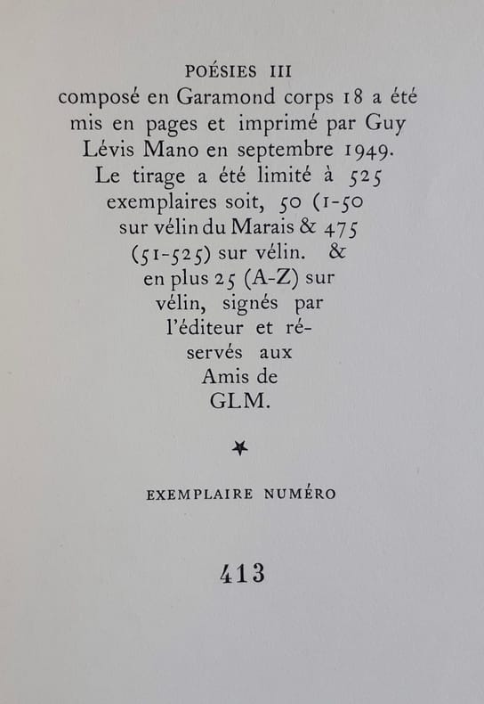 Paris : Guy Lévis Mano (GLM), septembre 1949. 1 volume (22,5x14,5cm), (46) pages. Edition originale tirée à 550 exemplaires : 1/475 sur vélin. Bon état.