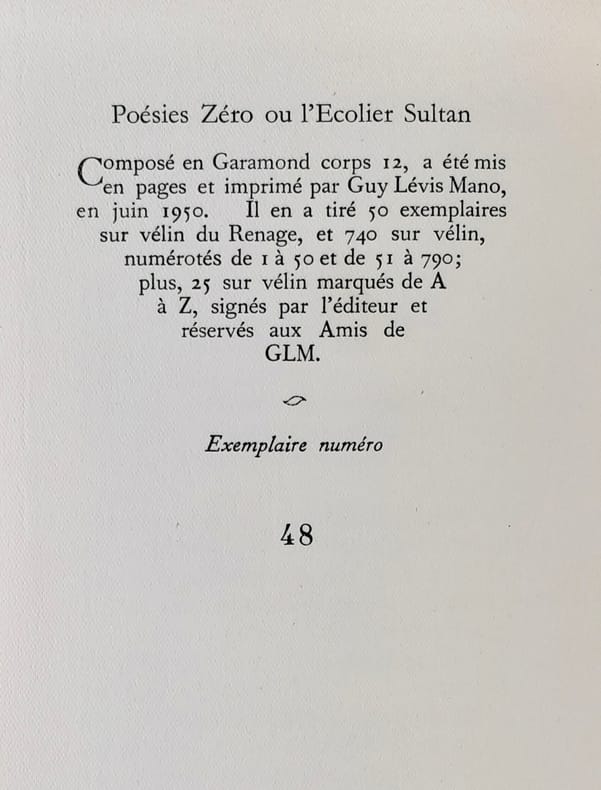 Paris : Guy Lévis Mano (GLM), juin 1950. 1 volume (19x11,2 cm), 56 pages. Edition originale tirée à 815 exemplaires : 1/50 sur vélin de Renage. Bon état.