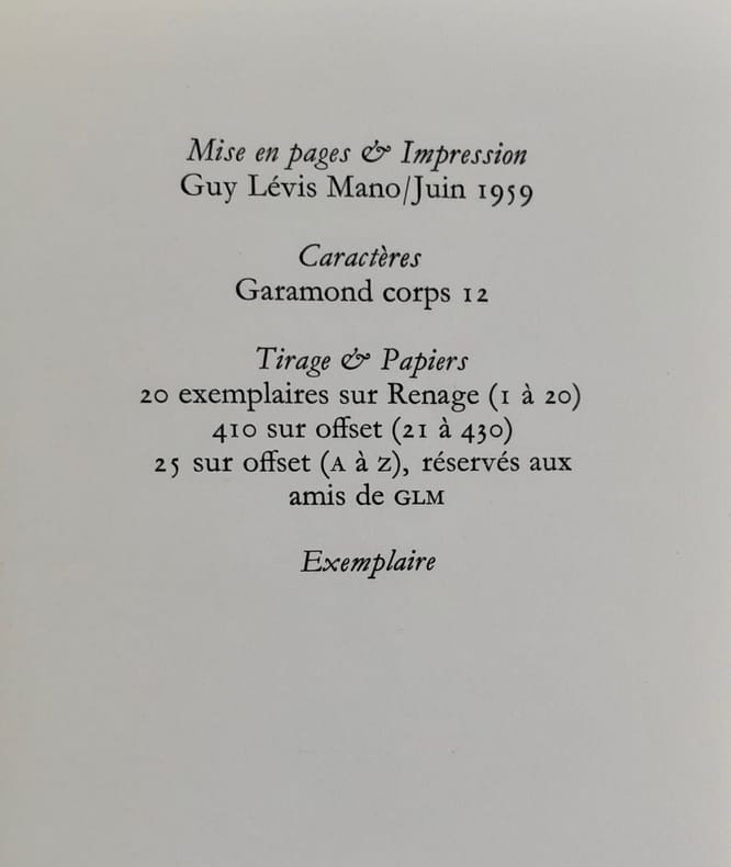 Paris : Guy Lévis Mano (GLM), juin 1959. 1 volume (16,5x10,5 cm), 36 pages. Edition originale tirée à 455 exemplaires : 1/410 sur offset. Bon état.